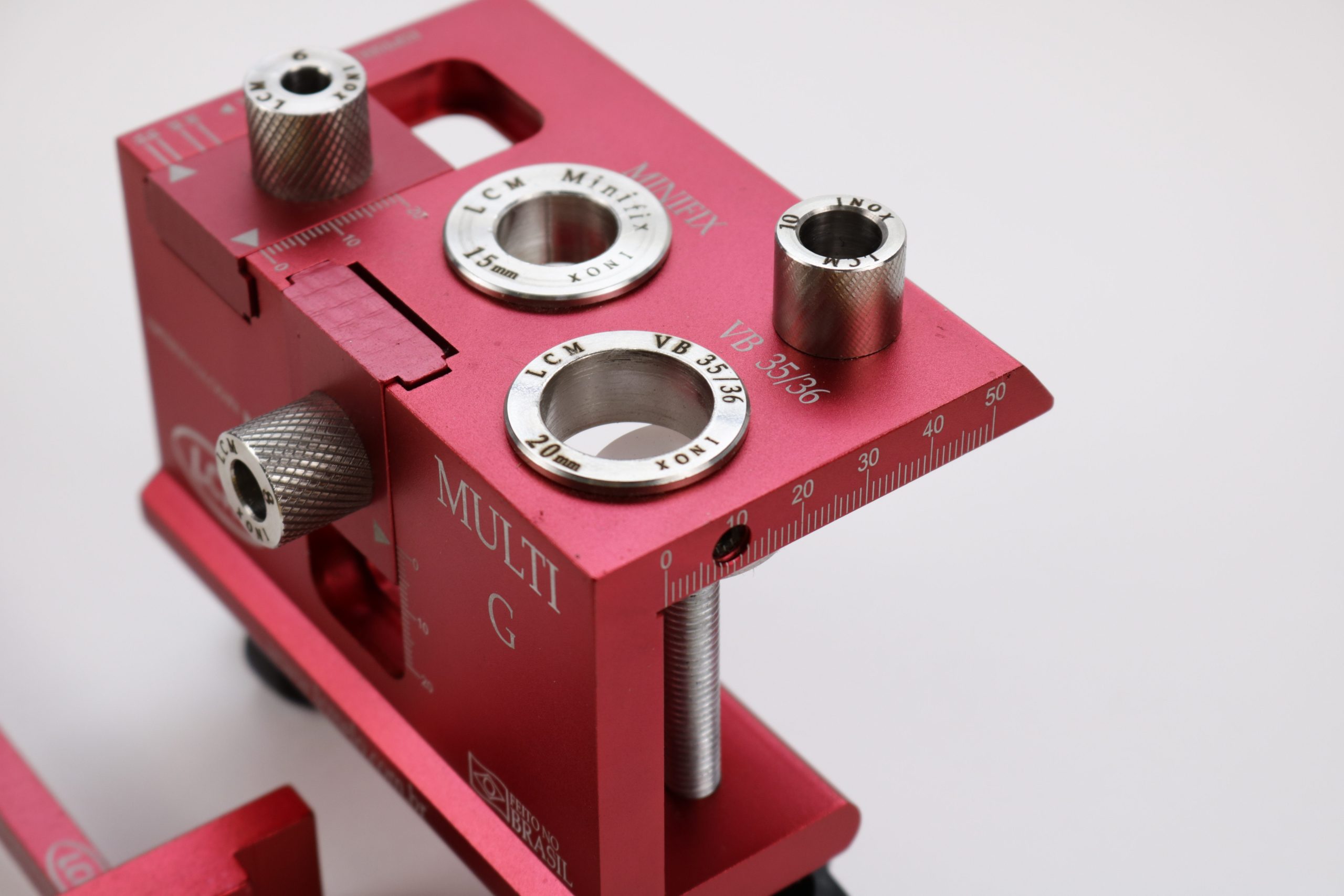 O gabarito Multi foi desenvolvido no intuito de efetuar as marcações de furações para montagem de moveis planejados, utilizando os diversos dispositivos de montagem existentes no mercado, tais como VB 35/36, Minifix e Cavilha. Possui a funcionalidade de marcações utilizando diferentes espessuras de peças de mdf e outros.